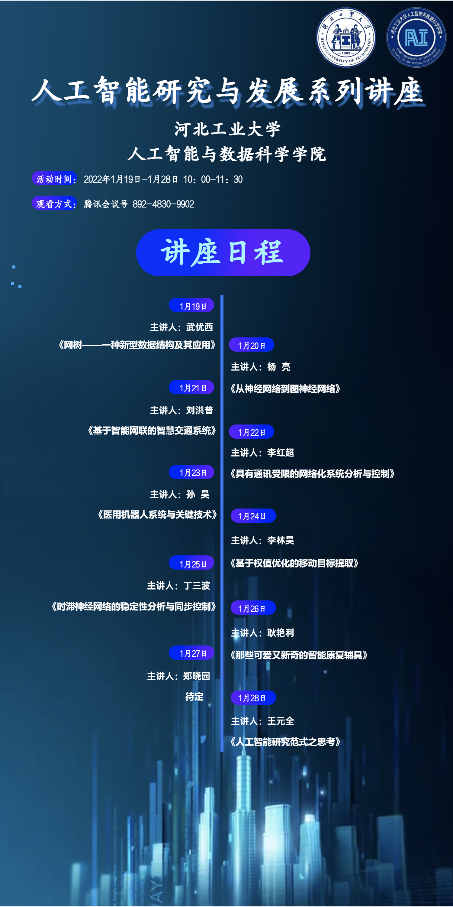 2022年寒假期间,h视频 师生以做好自身本职工作支持“抗疫行动”。为了丰富留校研究生的科研生活,扩大师生的科研视野,h视频 组织由多名“元光学者”组成的中青年骨干教师,为全校师生带来了“人工智能研究与发展系列讲座”。讲座内容包括智能康复、医疗机器人、智能交通、神经网络与复杂系统控制、新型大数据技术等多个人工智能前沿领域。欢迎广大师生参加。
