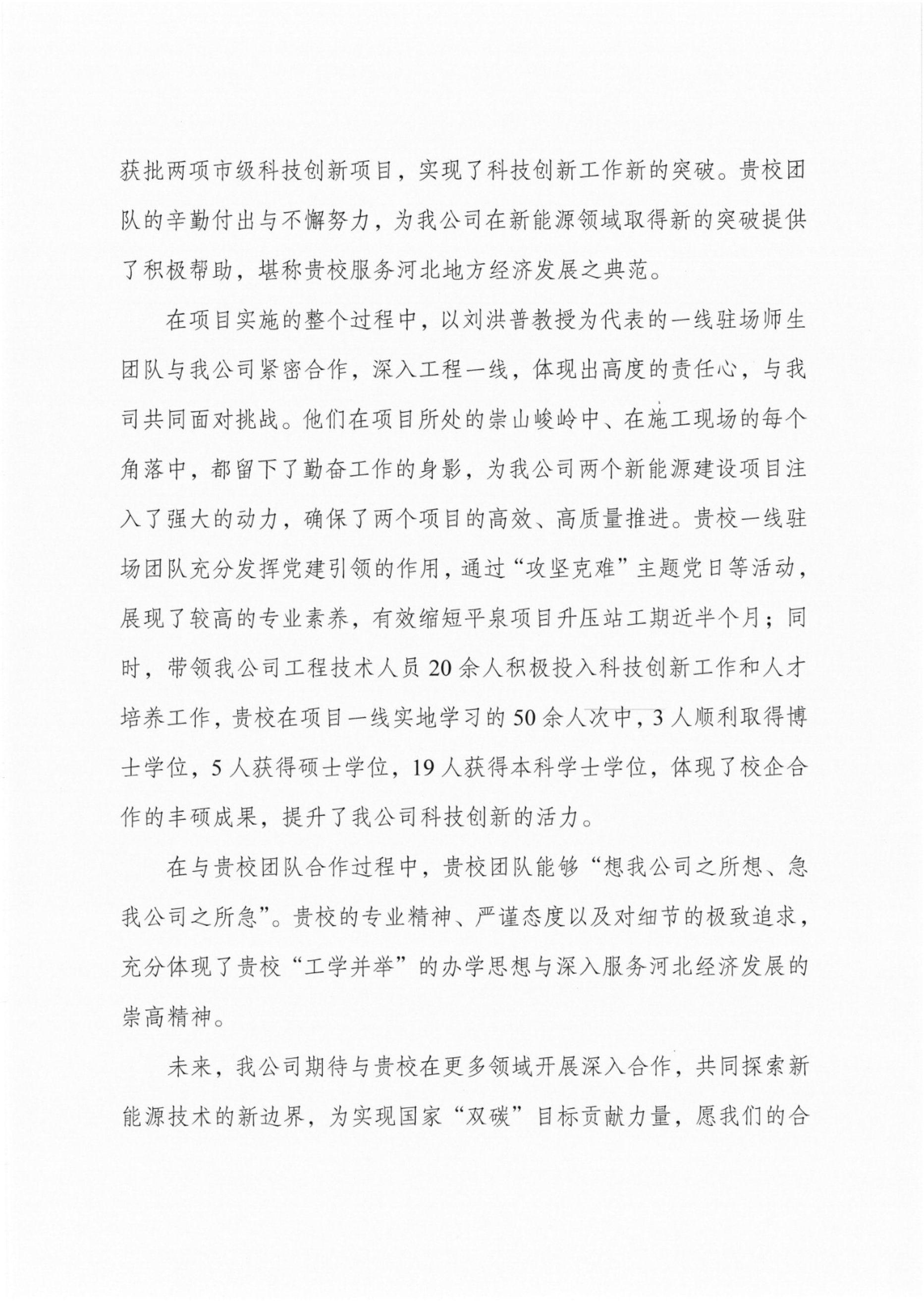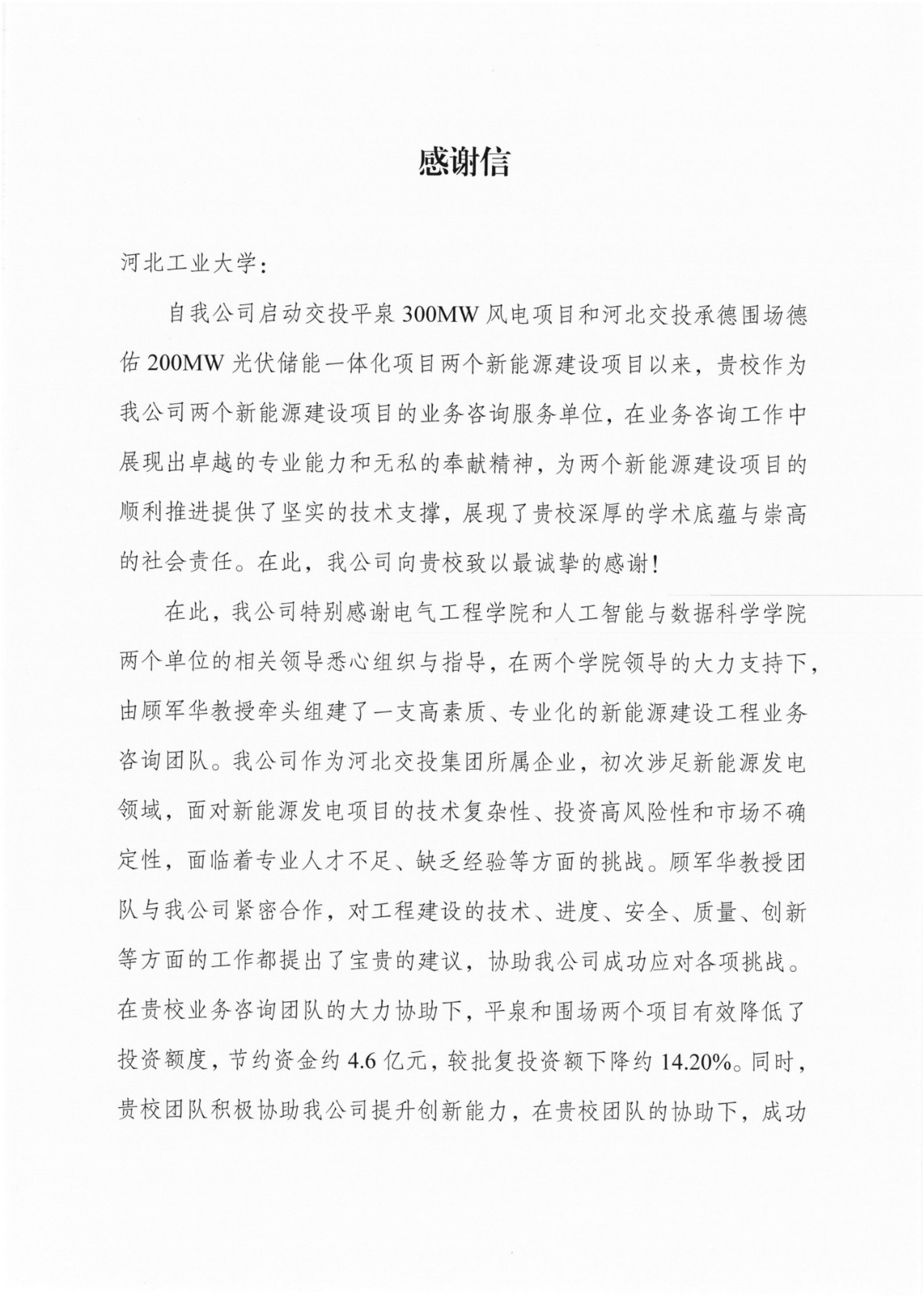 作为河北工业大学杰出校友,河北晟德基础设施建设开发有限公司党委书记兼董事长刘进首先对河北工业大学的新能源业务咨询团队的工作表示感谢,河北晟德基础设施建设开发有限公司从2021年开始涉足新能源业务,经过短短不到四年的发展,目前在建和持有的新能源建设项目指标达到了290万千瓦,占承德市104家新能源企业总指标的8.8%,发展势头强劲。面对新能源发电领域的技术复杂性、高风险性和市场不确定性,河北晟德基础设施建设开发有限公司作为河北交投集团下属公司,面临专业人才短缺和经验缺乏等挑战。河北工业大学组建的全方位、全过程业务咨询团队在工程建设的技术、进度、安全、质量、创新等方面提出宝贵建议,助力公司成功应对挑战。在团队协助下,平泉和围场两个新能源项目节省资金约4.6亿元,较批复投资额下降14.20%。此外在项目建设过程中,以刘洪普老师为代表的一线驻场师生团队与企业紧密合作,深入一线,展现高度责任心和使命感,确保项目高效、高质量推进。团队通过党建引领活动,缩短平泉项目升压站工期近半个月,并带领企业技术人员投入科技创新和人才培养,提升公司科技创新活力。