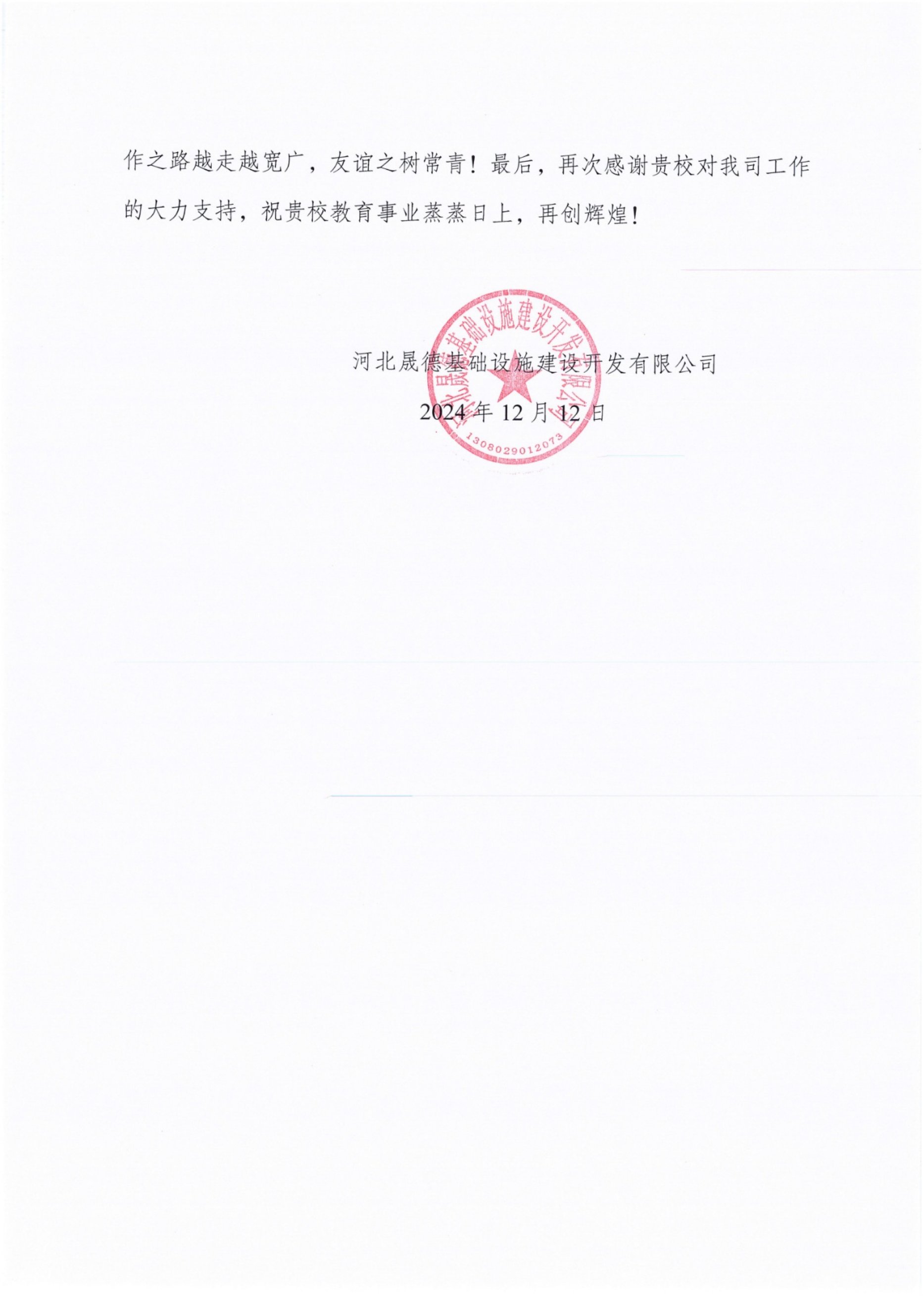 附:河北晟德基础设施建设开发有限公司致我校的感谢信