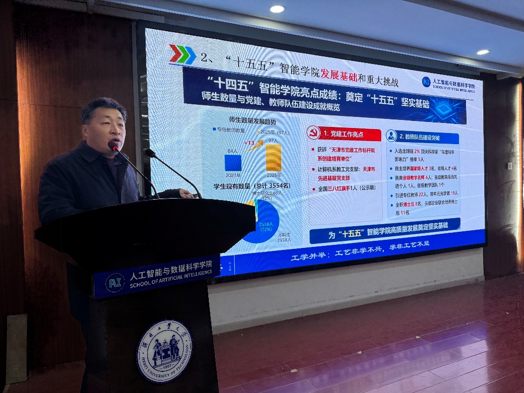 院长陈海永代表h视频 行政班子作题为《锚定目标,开拓创新,奋力谱写h视频 高质量发展新篇章》的工作报告。报告系统总结了h视频 在党建引领、人才培养、学科建设、科学研究、师资队伍、国际交流及内部治理等方面取得的重要进展,重点介绍了国家级一流本科课程、一级学科博士学位授权点申报、科研经费显著增长以及高层次人才引进与培育等方面取得的突破。