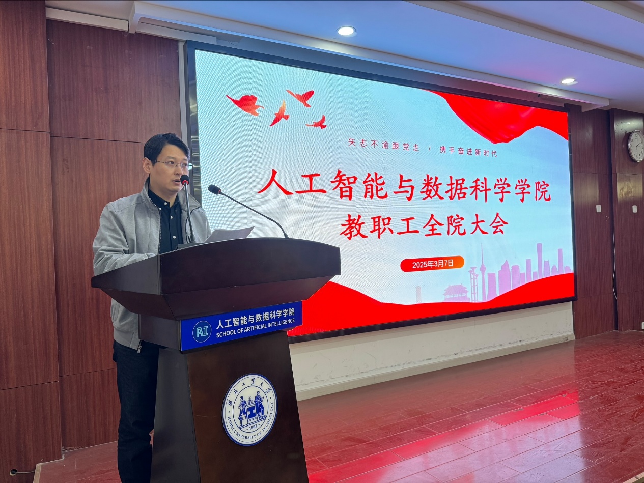 2025年3月7日下午,h视频 召开全院大会,全面部署2025年重点工作,统筹推进新学期教学、科研、学生管理等相关工作。会议聚焦“贯彻落实校第六次党代会精神、锚定人工智能重大发展机遇、加速构建智能学科高质量发展新格局”三大主题,明确了新一年h视频 的行动方向,为新学期高质量发展注入强劲动能。h视频 全体教师参加会议,会议由h视频 副书记兼副院长兰天主持。