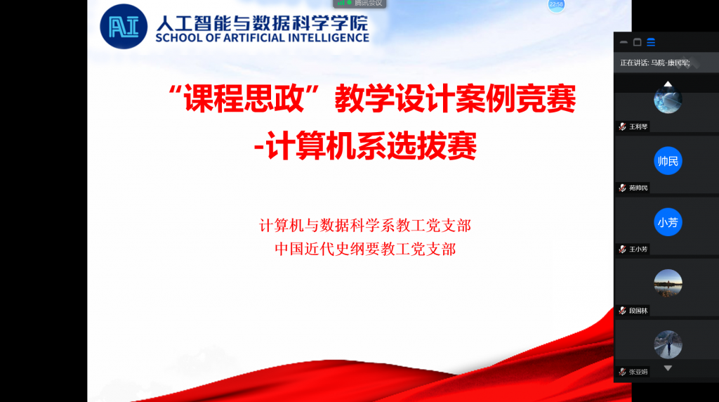 为落实“立德树人”根本任务,实施“铸魂育人”工程,提升教师课程思政建设的意识和能力,不断优化课程思政案例设计,切实把思想政治工作贯穿教育教学全过程,6月26日—29日,h视频 与马克思主义h视频 十个“结对共建”的教师党支部开展了线上“课程思政+思政课程”集体备课暨思政课教师指导专业课教师优化课程思政案例设计的教学研讨活动,h视频 领导班子成员深入各教学部门参加活动。联系计算机与数据科学系教师党支部的校党委常委、副校长段国林参加了本次活动并予以指导。